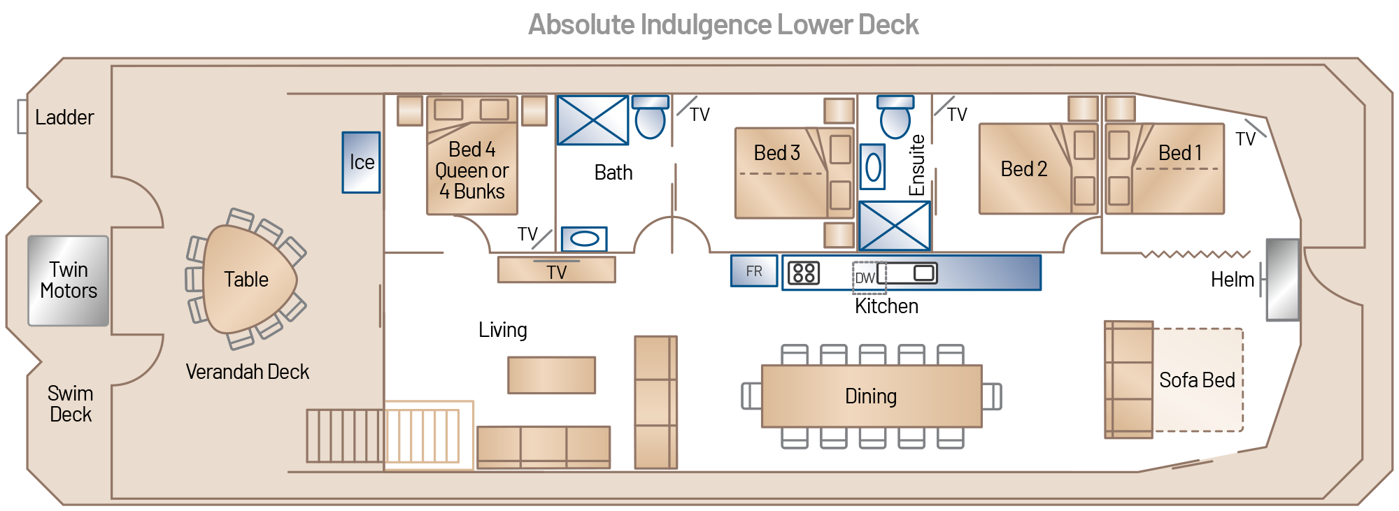 Starlink – No For those that expect the best, Absolute Indulgence delivers in style. Treat yourself to a houseboat holiday that will equal the finest world class accommodation.