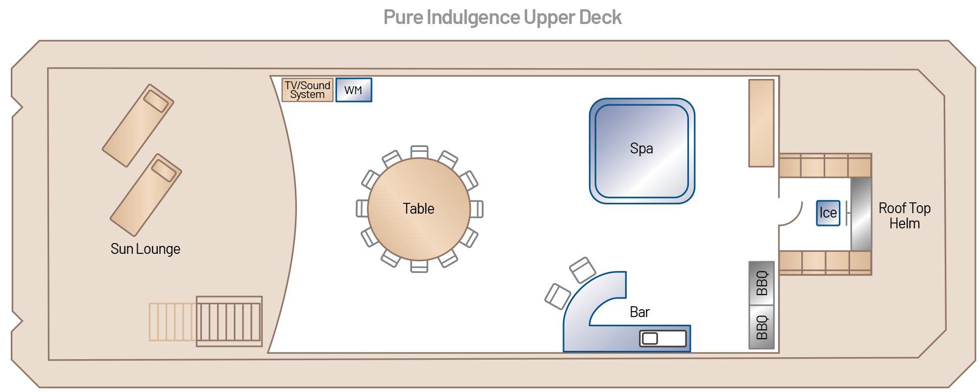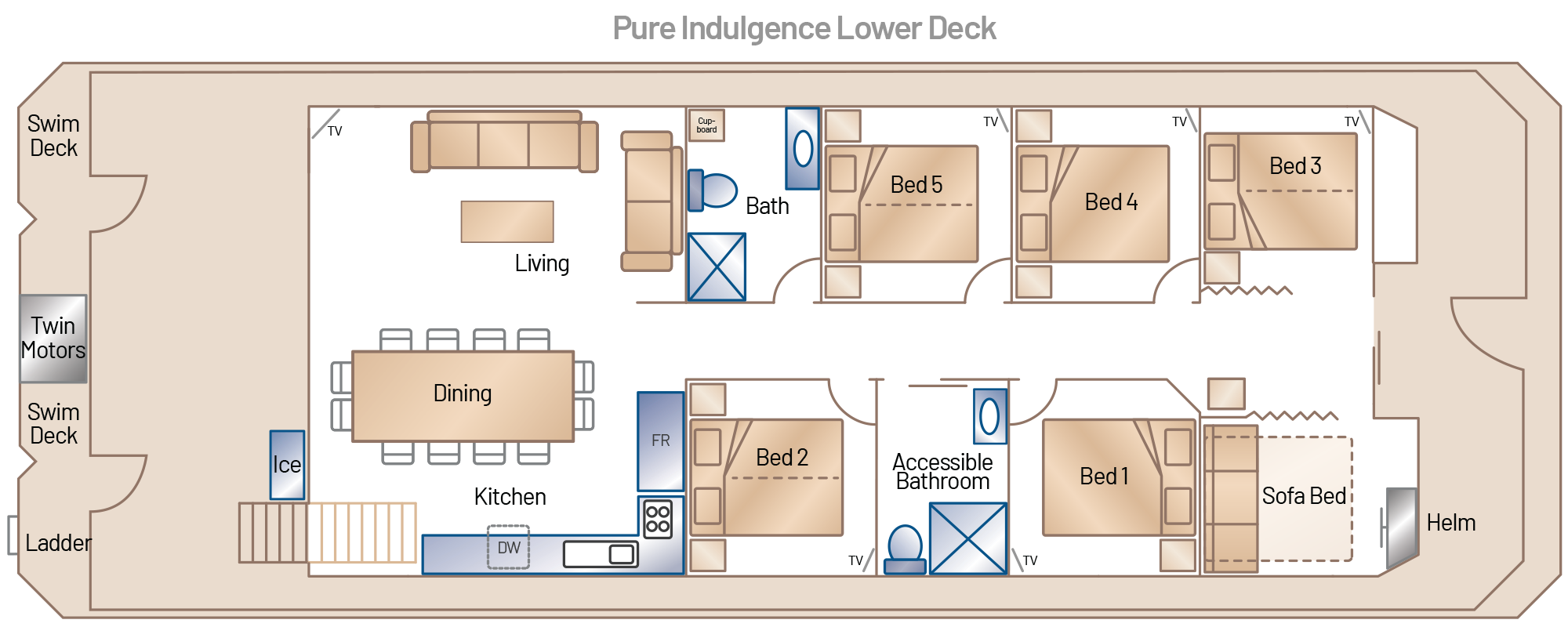 Where the river meets adventurous indulgence. Step aboard Pure Indulgence — a bold and spacious sanctuary where contemporary design, sweeping views, and high-end comfort redefine escape. With five suites, two bathrooms (including one wheelchair accessible), and spaces designed to be wheelchair and crane friendly, she blends luxury with ease of access. From designer living to the open-air spa deck, this is your floating retreat to unwind, reconnect, and embrace the best of river life.