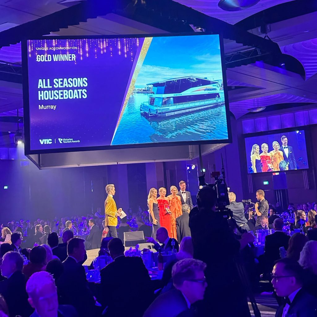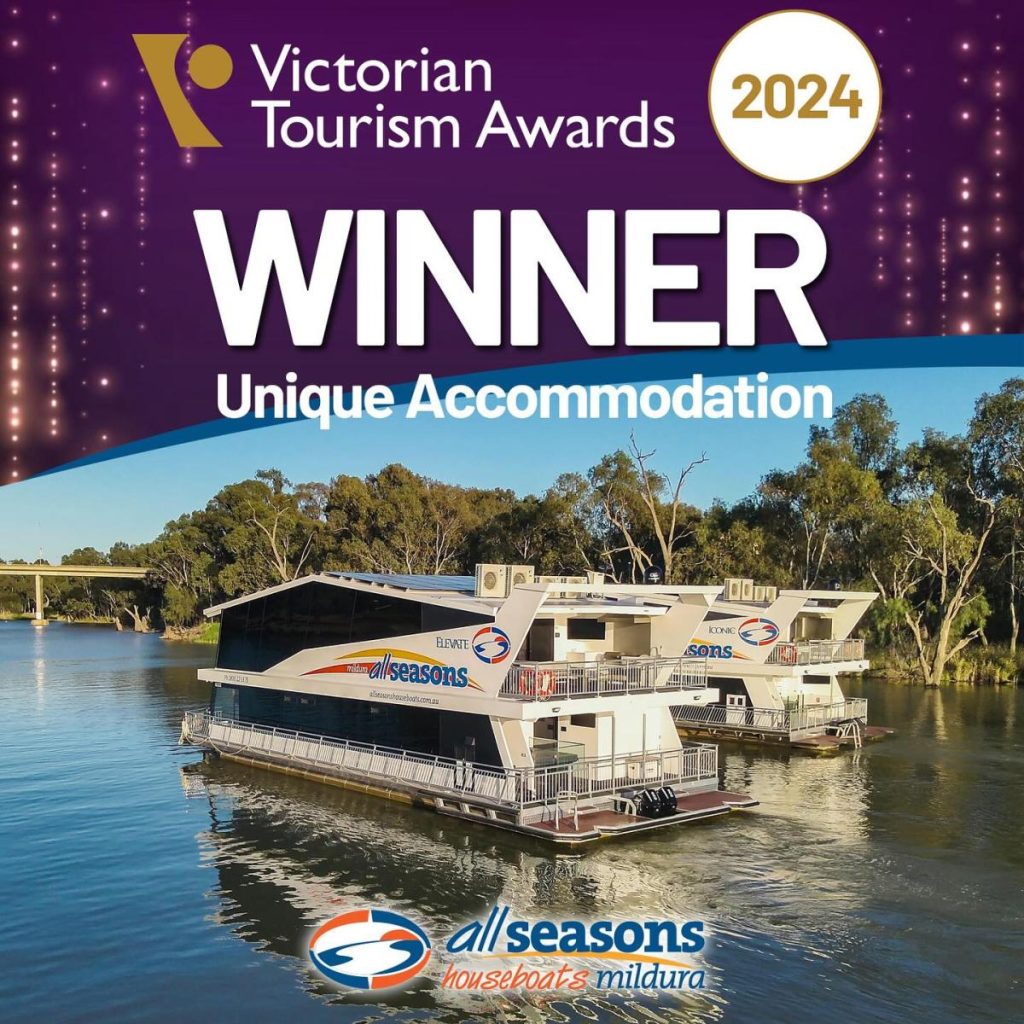 All Seasons Houseboats won the 2018 Riverina Mildura Tourism Awards and the 2017  Victorian Tourism Awards for Unique Accommodation. We have also been fortunate enough to win the Victorian Tourism Awards highest honours for Unique Accommodation three times meaning we’re now in the prestigious Hall of Fame!